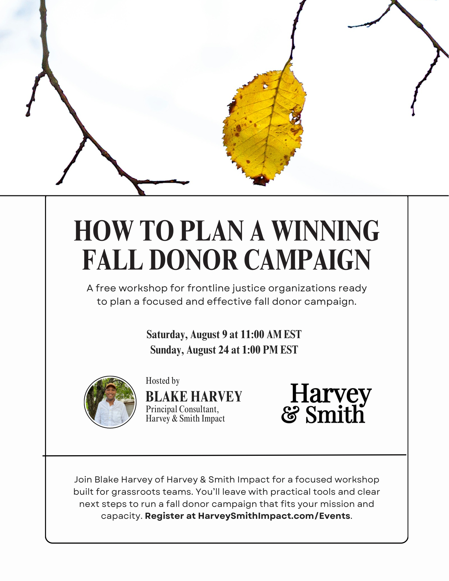 This free, one-hour strategy session is designed specifically for grassroots and frontline justice organizations looking to plan a focused and effective donor campaign for the fall season. Whether you’re a team of one or working with your board, this session will offer practical tools, clear structure, and realistic steps you can take to build momentum with your supporters.